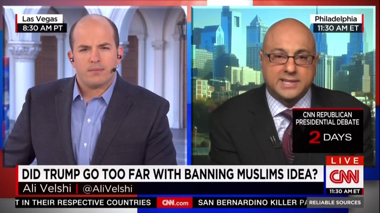 On the first Sunday after the San Bernardino attacks, CNN Reliable Sources host Brian Stelter ignored that in favor of a one-hour program focused on Donald Trump. Then on December 13, Stelter talked to al-Jazeera host (and former CNN anchor) Ali Velshi, and again he skipped over the murders of San Bernardino. Syed Farook? Tashfeen Malik? Stelter's only villain worth discussing was Trump.