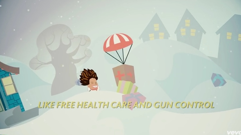 MACY GRAY: (Singing) All I want for Christmas is a whole bunch of stuff. But anything that you can buy me won't be enough 'cause everything I'm hoping for is intangible, like free health care and gun control. If you want to make the world a better place, say all right, all right. If you want a peaceful world for Christmas Day, say all right, all right. Christmas is here.