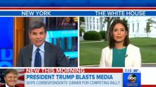 Still upset that President Trump decided to skip the White House Correspondents’ Dinner in favor of a rally with his supporters Saturday night, on ABC’s Good Morning America on Monday, co-host George Stephanopoulos whined: “President Trump celebrated his 100th day doing one of his favorite things, a fiery rally in Harrisburg, Pennsylvania, where he laid into the media just as so many were sitting down at the traditional White House Correspondents’ Dinner.”