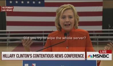 Tuesday night, four AP reporters (saved here for future reference, fair use and discussion purposes) — Jack Gillum and Stephen Braun in Washington, with the help of Ken Thomas and Eric Tucker in North Las Vegas — failed to report that Mrs. Clinton cut her press conference short after getting a genuine question from Fox News's Ed Henry, and that part of her answer to Henry's query about whether her hard drive was wiped was "With a cloth?"