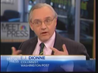To prove his claim, Dionne hysterically pointed out to his fellow "Meet the Press" panelists that whenever he's on NPR, he's often countered by "conservatives" - like New York Times columnist David Brooks (video follows with transcript and commentary):