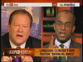 RON CHRISTIE, REPUBLICAN STRATEGIST: This is one of those instances that I was actually listening to "The Rush Limbaugh Show" and I`m sure you guys didn`t hear the entire thing before the segment, during the segment and after. In the segment actually referred to a segment, not on a network that we don`t know. It was on MSNBC where they were talking to former Congressman Martin Frost. And Frost said that the leadership battle that`s going on in the House of Representatives right now frankly has been reduced to perks, and whether or not Clyburn, if he is forced from his leadership position, will have to give up his driver, his security detail and of course the car. And Limbaugh said.