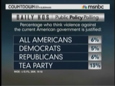 As he discussed new findings in a Daily Kos/Public Policy Polling survey about who thinks violence against the current American government is justified, the "Countdown" host highlighted the Tea Party's number while conveniently ignoring demographic groups that responded at an equal or higher rate (video follows with transcript and commentary):