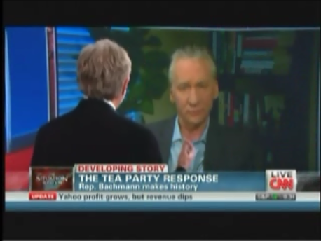 On Tuesday's "Situation Room," we got a hand from Wolf Blitzer when he marvelously countered Maher's complaint that CNN's decision to air Congresswoman Michele Bachmann's (R-Minn.) Tea Party response to the President's State of the Union address was depriving Democrats of equal time (video follows with transcript and commentary):