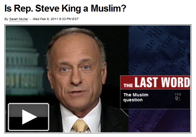 Despite this, the folks at MSNBC must have been proud of O'Donnell's behavior for the video of this entire segment was posted at "The Last Word Blog" with the headline "Is Rep. Steve King a Muslim?"