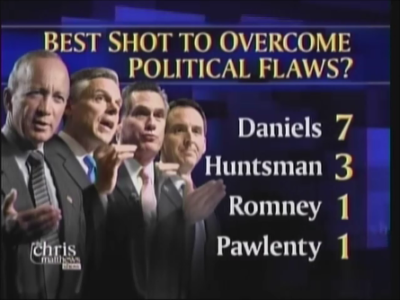 CHRIS MATTHEWS: We put it to the Matthews Meter, twelve of our regulars including Howard, Katty and Norah, “Which candidate has the best shot to overcome his obvious flaw?” Well this is surprising I guess. Seven said Mitch Daniels. Three said John Huntsman, two, one each for Mitt Romney and one for Pawlenty.