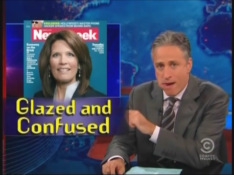STEWART: Conservatives hate the liberal media so much they're even willing to accept an argument based on science! And you know, the worst part about when the Right complains about the mainstream media? When their argument contains a kernel of truth. Ugh! Case in point, this week's Newsweek cover which seems to have captured Minnesota Congresswoman Michele Bachmann at the exact moment she sees the Amazing Ribaldo turn his hat into a dove. “That's amazing! When do we start the photo shoot?”