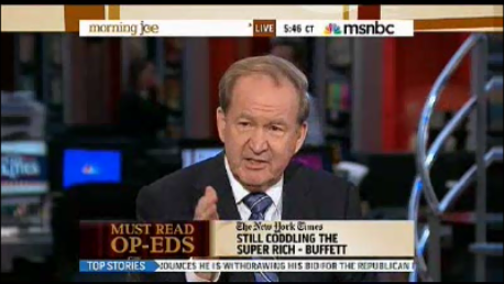 This led MSNBC's Pat Buchanan on Monday's "Morning Joe" to challenge the Oracle of Omaha asking, "Why doesn’t he set an example and send a check for $5 billion to the federal government?" (video follows with transcript and commentary):