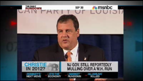COSTA: One thing I've really learned, Chuck, is that Chris Christie is his own political adviser. He's a political operative and thinker in his own right. This is not a creation of consultants. From when he was running for state assembly in 1995 he was a freeholder in Morris County. This is a man who makes his own political decisions. And this comes down to him He's been traveling with Bill Palatucci and other senior advisers. But this comes down to Chris Christie and really how he thinks he can get swayed into the election. And this week every single close person to Christie has changed his mind. His reception in Louisiana, in California, in Missouri has had a big impact.