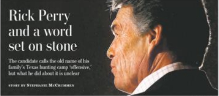"Perry’s father painted over offensive language on a rock soon after leasing the 1,000-acre parcel in the early 1980s. When Governor Perry was party to the hunting lease from 1997 to 2007, the property was described as northern pasture. He has not been to the property since 2006.