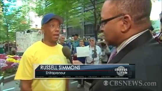 RUSSELL SIMMONS AT OCCUPY WALL STREET, OCTOBER 10, 2011: I’ve been here since kind of the beginning…I come because I’m, I’m, I love their intention and their effort and their courage and I’m just a big supporter of the work these young people are doing. They want the money out of Wall Street. They want the power to the people. It’s an old chant…I’m happy to pay more taxes, though. I’m here to pay more taxes.