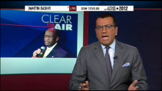 MARTIN BASHIR: Because Mr. Cain is such a showman, because he preaches the need for a sense of humor, it's easy for us to be seduced by his rapid-fire one liners, his singing of "Imagine there's no pizza," and his smoking chief of staff. It's all good fun. But while Mr. Cain's campaign might be a joke, his conduct, his alleged conduct, is not. In fact, as the accusations pile up, Mr. Cain seems less funny by the day and more like a dirty old man.