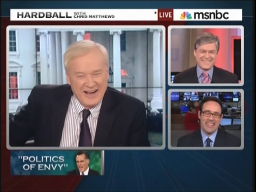 On Wednesday's Hardball, host Chris Matthews and his guests Chris Cillizza of the Washington Post and John Harwood of the New York Times actually laughed at Mitt Romney's sons (video follows with transcript and commentary):