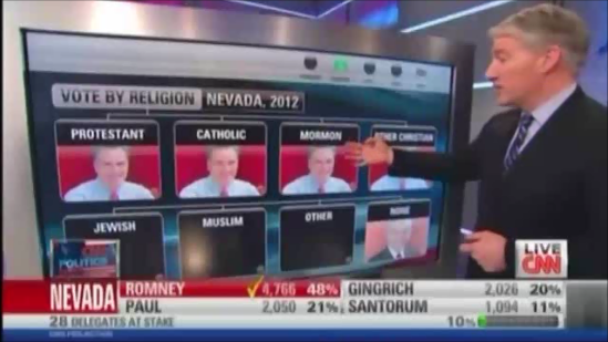 Let's just look at one more as we come down the line here. If you look here among faith, obviously Governor Mormon is a member of the Church of Jesus Christ of Latter Day Saints. He's a Mormon, and he won big among Mormons. He won 9 out of every 10 votes among Mormons. Congressman Paul coming in second place. But he also won those who say they have no religion, voted for Congressman Paul.