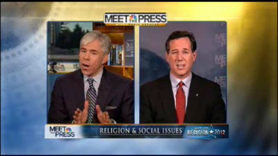 FMR. SEN. SANTORUM: Yeah, they, they are deeply held views, but they're not what I dominantly talk about, David. You're taking things that over a course of a 20-year career and pulling out quotes from difference speeches on, on issues that are fairly tangential, not what people care about mostly in America, and saying, "Oh, he wants to impose those values." Look at my record. I've never wanted to impose any of the things that you've just talked about. These are, these are my personal held religious beliefs, and in many forums that I, that, that are, in fact, religious, because I do speak in front of church groups and I do speak in these areas, I do talk about them. But there's no evidence at all that I, that I want to impose those values on anybody else.