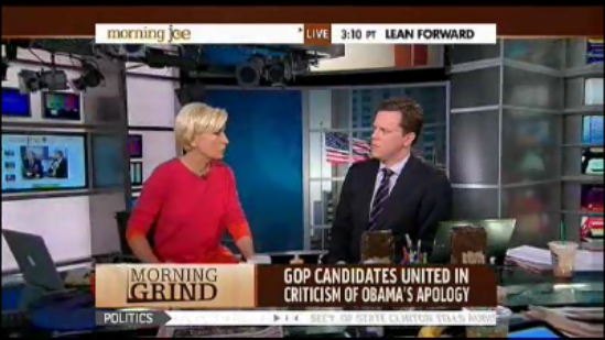 “What am I missing,” asked Brzezinski, “because if, for example, Willie, I’ll let you take it because I don’t want to sound too shrill, but let’s say the American flag was inadvertently burned. Would that not require an apology from another leader if the same scenario played out?”