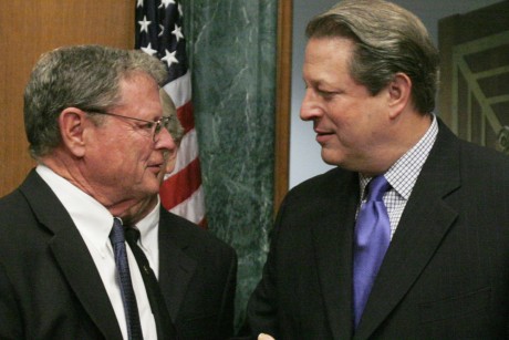 INHOFE: First of all, what they’re saying is I don’t agree with that. And secondly, even if that were true, which I don’t think that is, all the people say you never want to take one incident and say that this is some evidence of climate. There’s a difference between weather and climate. And as you well know, if you take all Gore’s speeches – I have a long list in here of all of Gore’s speeches that he had to stop in the middle of them because of the cold weather—