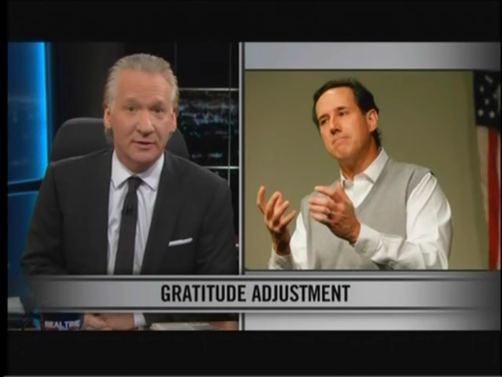 BILL MAHER: New Rule, President Obama must stand up and thank the man who’s been out there day after day tirelessly helping his campaign – Rick Santorum. Every time I turn on the news, Christy McSweatervest has just said something crazier than the last crazy thing he said. He said JFK makes him want to throw up – not the man, the airport, because if God had wanted man to fly, he wouldn’t have made flight attendants so gay.
