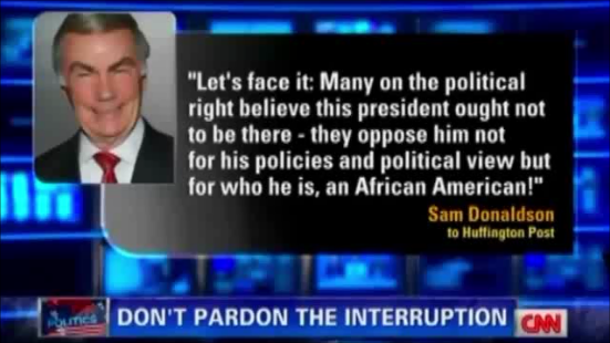 As NewsBusters previously reported, former White House correspondent Sam Donaldson said Saturday, "Many on the political right believe this president [Barack Obama] ought not to be there – they oppose him not for his policies and political view but for who he is, an African American!”
