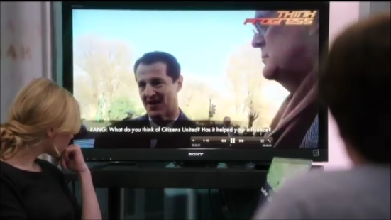 So, David Koch in January 2011, at the end of a surprise, unscheduled interview with Fang, answered a question about Citizens United by incredulously saying, "Citizens United?"