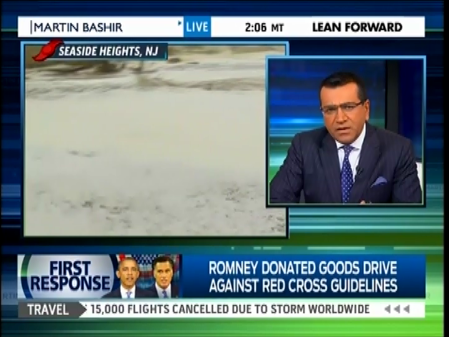 *****Update II: It turns out MSNBC's Andrea Mitchell ridiculed Romney's storm relief rally hours before Bashir. Insanity surely runs rampant at this network.