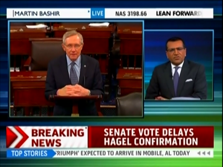 When Bashir claimed the just-ended failed cloture vote on Chuck Hagel for Defense Secretary was "an example of the fractures in the Republican Party because at the beginning of the day we didn't think that Harry Reid would get any Republican votes," O'Donnell responded, "Actually, not a surprise, not a surprise" (video follows with transcript and commentary):