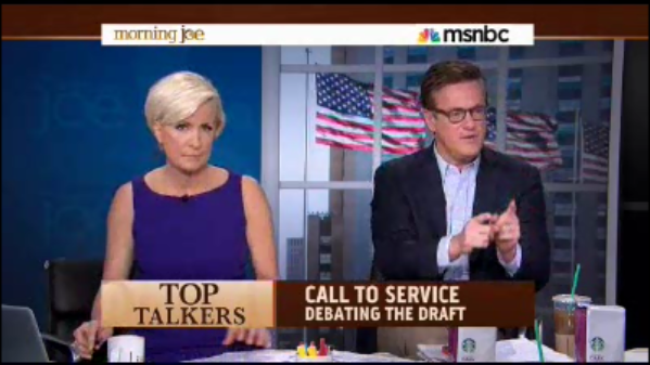 On Tuesday’s Morning Joe, the host actually called for the draft to be implemented and those not wanting to enter the military to be required at age eighteen to perform community service for two years (video follows with transcribed highlights and commentary):