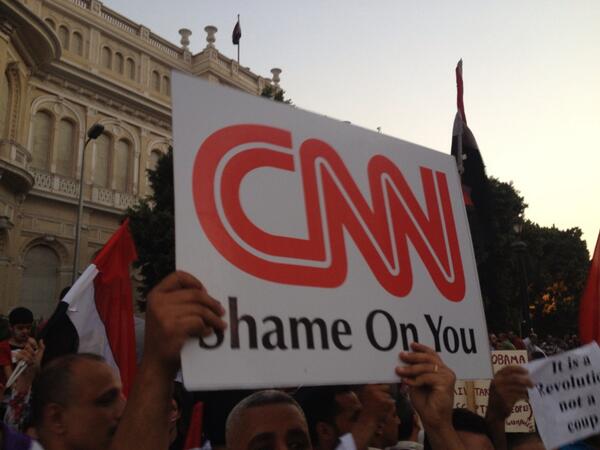 Based on replies, the "shame on CNN' signs have their origin in CNN calling events a "coup" and a shot of Tahrir mislabeled pro-Morsi crowd.