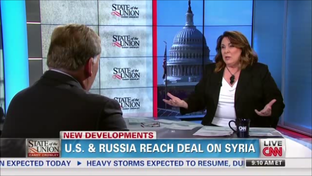 During a State of the Union discussion about the American-Russian agreement concerning Syria, Crowley asked a skeptical Congressman Mike Rogers (R-Mich.), "Who cares" that "Russia got the diplomatic edge?" (video follows with transcript and commentary):