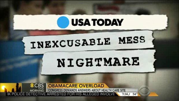 After reporting on a Dallas man that tried for a week to sign up without any success on Tuesday's Evening News, CBS This Morning Wednesday featured a segment tearing the program apart with Jan Crawford saying "the website’s launch has been nothing short of disastrous" (video follows with transcript and commentary):