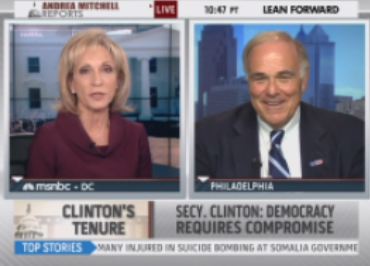 The liberal media's lovefest for Hillary Clinton continues apace. Andrea Mitchell’s interview with the outgoing secretary of state will air today, but don’t expect to see many tough questions. We already know what Mitchell thinks about Clinton, based on a comment she made on Tuesday’s Andrea Mitchell Reports. Talking with MSNBC political analyst Ed Rendell, Mitchell declared of Clinton, “She has done such a job by everyone’s account as secretary of state.”