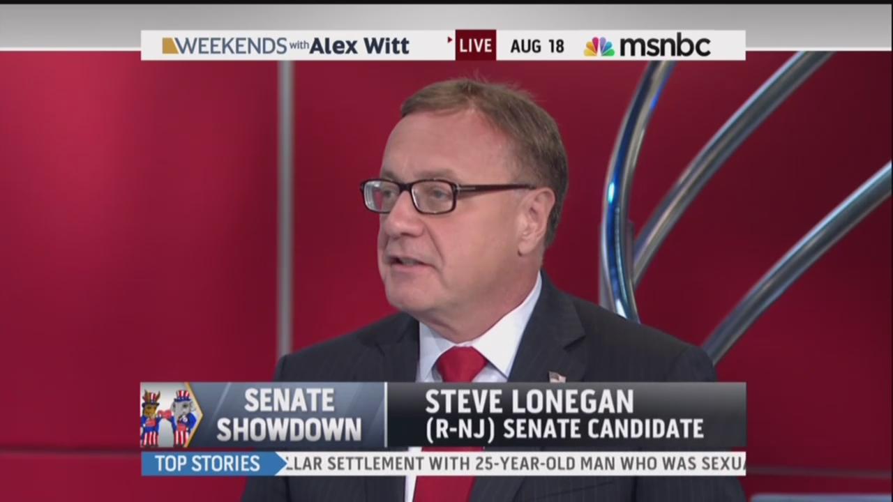 ALEX WITT: The battle for U.S. Senate in New Jersey is in full swing with nominees now selected for both parties ahead of the October 16th special election to fill the seat of the late Senator Frank Lautenberg. Democratic Mayor Cory Booker and Republican Steve Lonegan each won their respective primaries last week. And joining me now here in studio is New Jersey Republican nominee for U.S. Senate Steve Lonegan. Welcome to you, Steve. We’re glad you’re here.