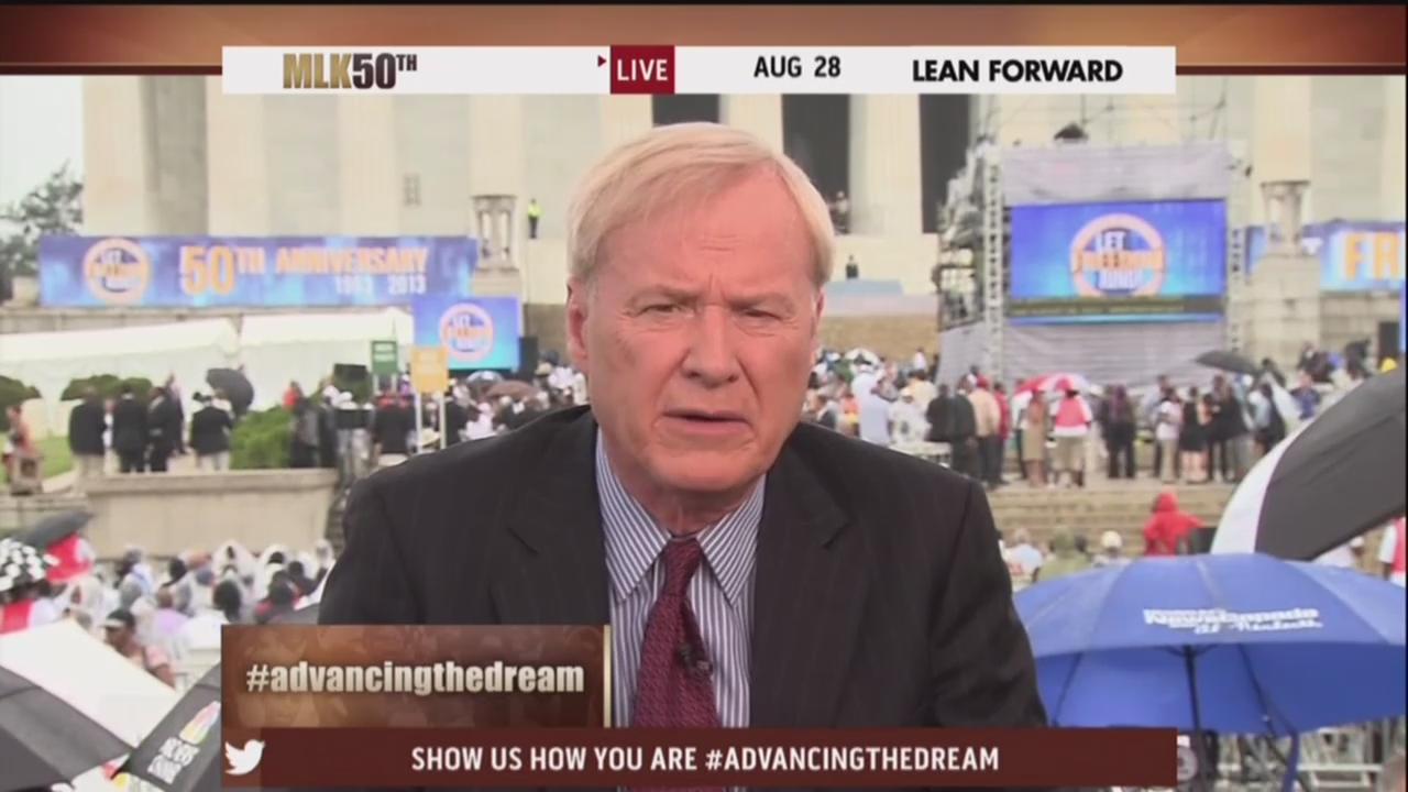 THOMAS ROBERTS: We do have an interesting statement coming from former president George W. Bush, releasing a statement and as we’re looking there, the Martin family there under that umbrella as they all assemble. “Our country” – this is from President Bush – “Our country has come a long way since that bright afternoon 50 years ago, yet our journey to justice is not complete. Just to the east of the Lincoln Memorial, where President Obama will speak on Wednesday, stands the Martin Luther King Memorial. There on the National Mall our president, whose story reflects the promise of America, will help us honor the man who inspired millions to redeem that promise.” And President Bush refers to the promise of America, Chris, that is reflected in President Obama. When we think about that, how significant does that weigh on this presidency that basically Barack Obama really personifies, comes to life as the dream of MLK?