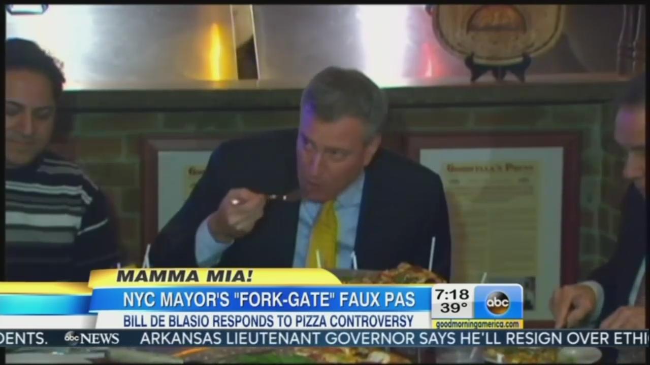 RON CLAIBORNE: You know, this is a pretty ugly way to start your way in office here in New York City. The New York Daily News is calling it – predictably perhaps – “Forkgate” and offered this harsh denunciation of the city’s mayor, saying he was eating his pizza like a tourist. Ouch. [Begin tape] Everybody, especially every New Yorker, knows there is only one way to eat a slice of pizza. Duh.