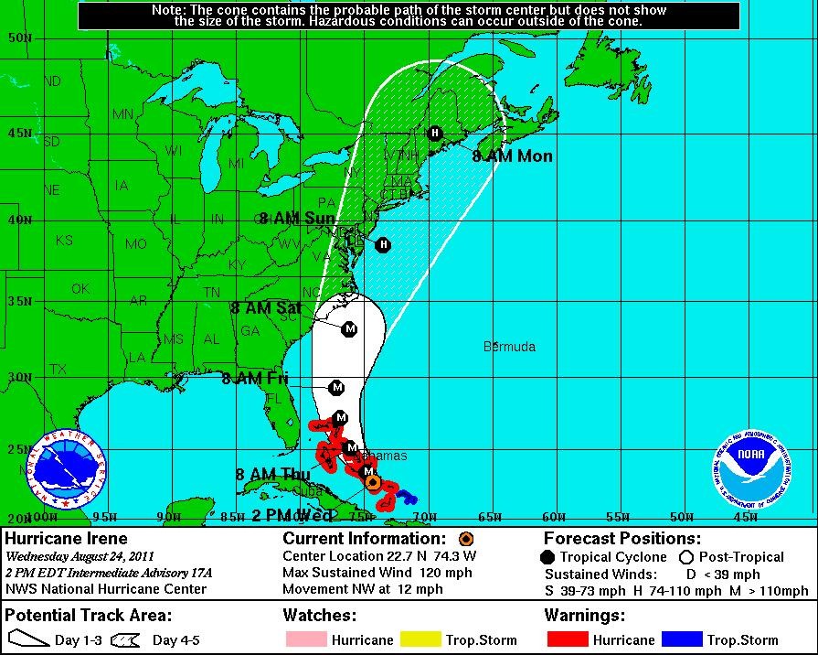 Where the cone of Irene is projected to pass over. Okay, please return to your vital front page story: