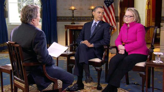 It's a reasonable question to ask because the Extra host's interviews of celebs like Angelina and Brad couldn't have been any more of a puff piece than Kroft's starry-eyed interview of President Obama and Secretary of State Hillary Clinton on Sunday's 60 Minutes. A half hour of softballs were gently served up by Kroft who acted as if he were overjoyed to just bask in the glow of his interviewees who ate up almost all the time praising each other. Oh, there was the obligatory question that Kroft was almost required to ask about Benghazi but it was delivered in such a manner as to be easily deflected by Hillary before the interview returned to full empty calorie cotton candy mode.