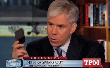 Obviously dissatisfied with LaPierre's answers to his questions on Sunday, the NBC moderator held up the empty gun magazine and waved it around while pressing the NRA executive to back down on his stance supporting gun rights.