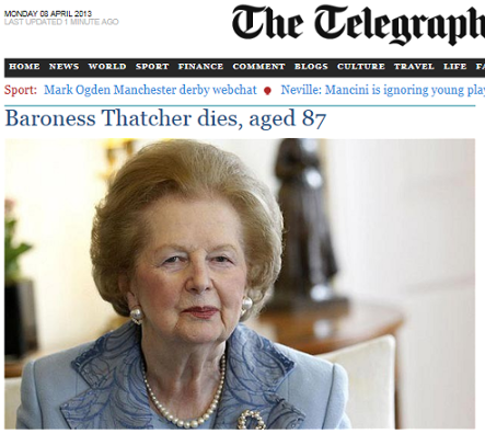 Upon learning that former British prime minister Margaret Thatcher had died of a stroke on Monday, the Daily Telegraph published an obituary that stated she “was not only Britain’s first woman prime minister, she was also the outstanding peacetime leader of the 20th century.”