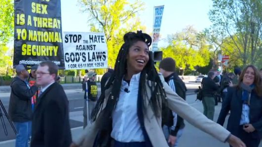 The scene then changed to the previous Tuesday, when black reporter Jessica Williams joined protesters in front of the Supreme Court and used a tissue to pretend she was crying while talking with the people who “came out in force” against gay marriage.
