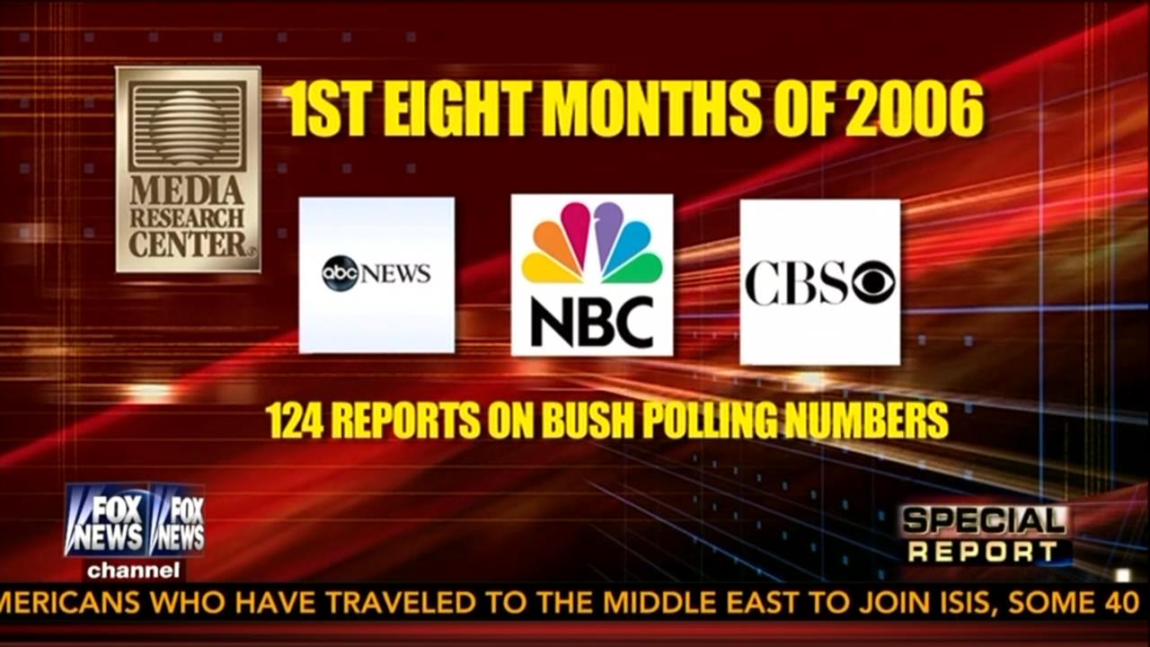 Such coverage is in stunning contrast to how those same newscasts relentlessly emphasized polls showing bad news for George W. Bush during the same phase of his presidency. Media Research Center analysts reviewed every reference on the ABC, CBS and NBC evening newscasts to public opinion polls from January 1 through August 31, 2014, and from the same time period in 2006. Eight years ago, the networks aired 124 evening news reports which cited public opinion polls about either President Bush’s overall approval rating or his handling of specific policies. In 2014, those same broadcasts produced only nine reports which mentioned public opinion surveys related to President Obama.