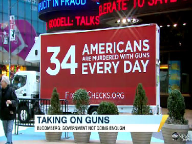GMA even featured a truck promoting Fixgunchecks.org, highlighting the parked vehicle just outside ABC studios. Ignoring ideological labels, Stephanopoulos introduced, "New York Mayor Mike Bloomberg joins us now. He's co-founder of Mayor's Against Illegal Guns and he's unveiling a new campaign today to toughen gun control."