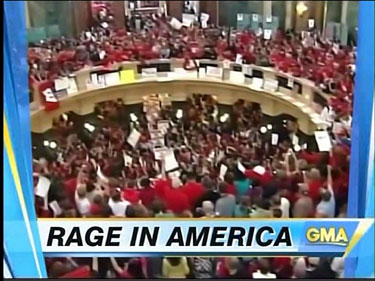 GEORGE STEPHANOPOULOS: And this morning, high-stakes battle the heartland. Thousands converge on Wisconsin's capital, camp-out overnight, to protest the governor's budget cuts. Teachers call in sick. And Democrats escape the state to prevent a vote. Is your state next?