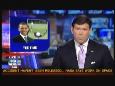 In an earlier segment, Baier singled out the Bozell quote, but also highlighted Obama himself: "President Obama even joked with reporters Saturday night about his fondness for sport, saying, quote, 'I'm not spending time on the golf course. I'm investing time in the golf course.'"