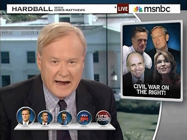 CHRIS MATTHEWS: Good evening, I'm Chris Matthews down in Washington. Leading off tonight, civil war on the right. Not since the election of Abraham Lincoln has a Republican caused such a war. Everybody attacked Mitt Romney today, the very day he declared for President. Sarah Palin went right to New Hampshire, serving as a human grenade, blowing up his announcement by saying Romney's health care is a total violation of Tea Party beliefs. Then, Rudy Giuliani, also in New Hampshire today, declared that Romneycare, and that's the word he used, is just as bad as Obamacare. Then, George Pataki attacked, but it was Palin who blew apart any notion that Romney can get the backing of the Tea Party.