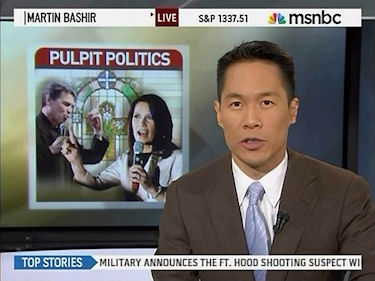The guest host for Martin Bashir interviewed Frank Schaeffer, a blogger on the liberal Huffington Post website and also a constant critic of the religious right. Schaeffer, the son of a conservative theologian, excoriated conservatives: "But, I came to understand that these people actually hate the United States as it is."