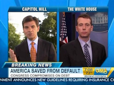 Good Morning America's George Stephanopoulos on Monday hit senior White House advisor David Plouffe from the left, highlighting liberal columnist Paul Krugman's complaints about the debt ceiling deal. The morning show also played up a Democratic congressman's attack that the bill is a "Satan sandwich."