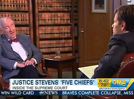 GEORGE STEPHANOPOULOS: Supreme Court Justice John Paul Stevens stepped down last year after more than 34 years on the bench, capping a remarkable tenure in which the soft-spoken Republican appointee became a forceful leader of the court's liberal wing. Now 91, Stevens has not missed a step, writing a new memoir, called Five Chiefs about the five chief justices he's known during an incredible career. We spoke this week at the office Stevens keeps at the Supreme Court. And I began by asking which of his thousands of his decisions makes Stevens most proud.