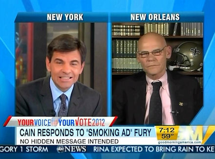 Stephanopoulos, a former Democratic operative and longtime friend of Carville, offered his colleague free rein. Carville excoriated an ad featuring Cain's campaign manager smoking. He berated, "I saw him smoking a cigarette. If that guy wasn't drunk, I haven't taken a drink in my life. He was as high as he could be." (It should be pointed out that, just ten days ago, Pew Research found that Barack Obama was getting far worse coverage than any of his Republican rivals.) [MP3 audio here. Video can be downloaded here.]