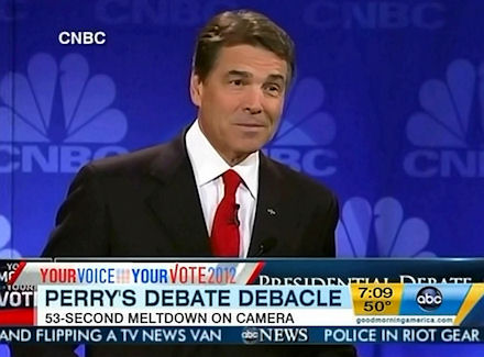 On Thursday's GMA, a graphic bombarded, "Perry's Debate Debacle: 53 Second Meltdown on Camera." Co-anchor George Stephanopoulos spent his interview with Rick Perry piling on: "But you did look like you were in pain during that answer last night. What but your thinking about?"