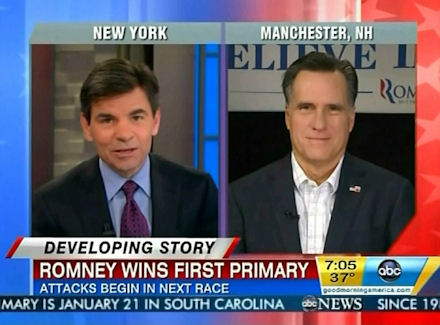 The Republican presidential candidate showed up on CNN, ABC, NBC, CBS, Fox News and MSNBC. However, it was CNN's Soledad O'Brien who offered the most transparently partisan attack. Citing DNC Chairman Debbie Wasserman-Schultz, O'Brien parroted that this "was not a victory." The "Starting Point" anchor admitted that Wasserman-Schultz's job was to "spin," but continued, "But doesn't she have a point [that]... this is a place [New Hampshire] where you have lived, and that number, while very good, is not 60 percent, or 70 percent?"